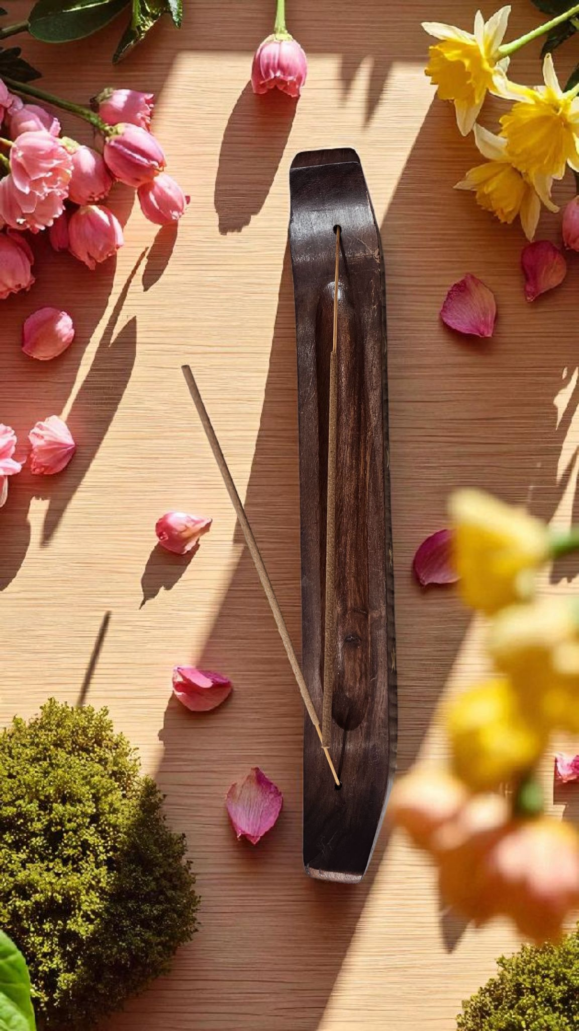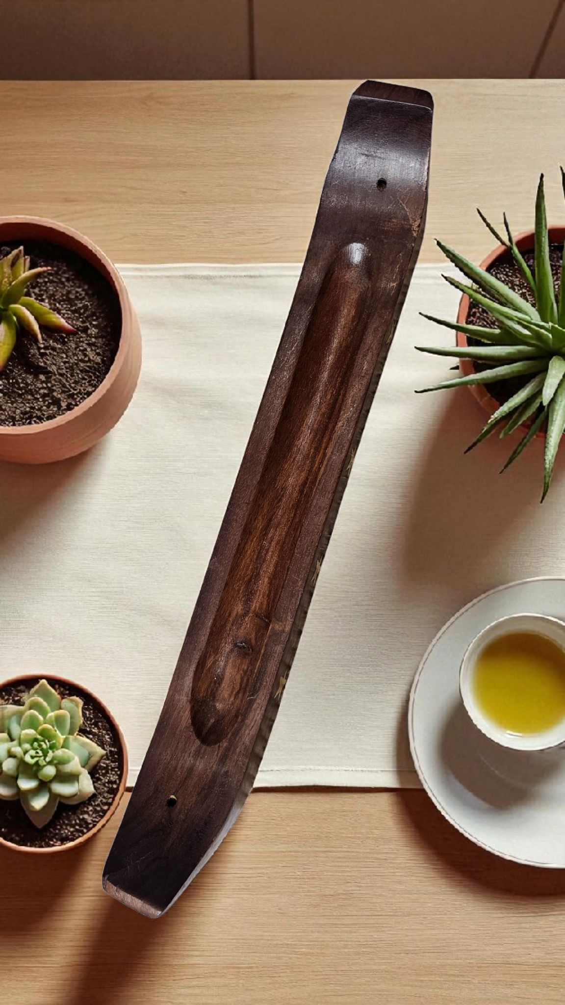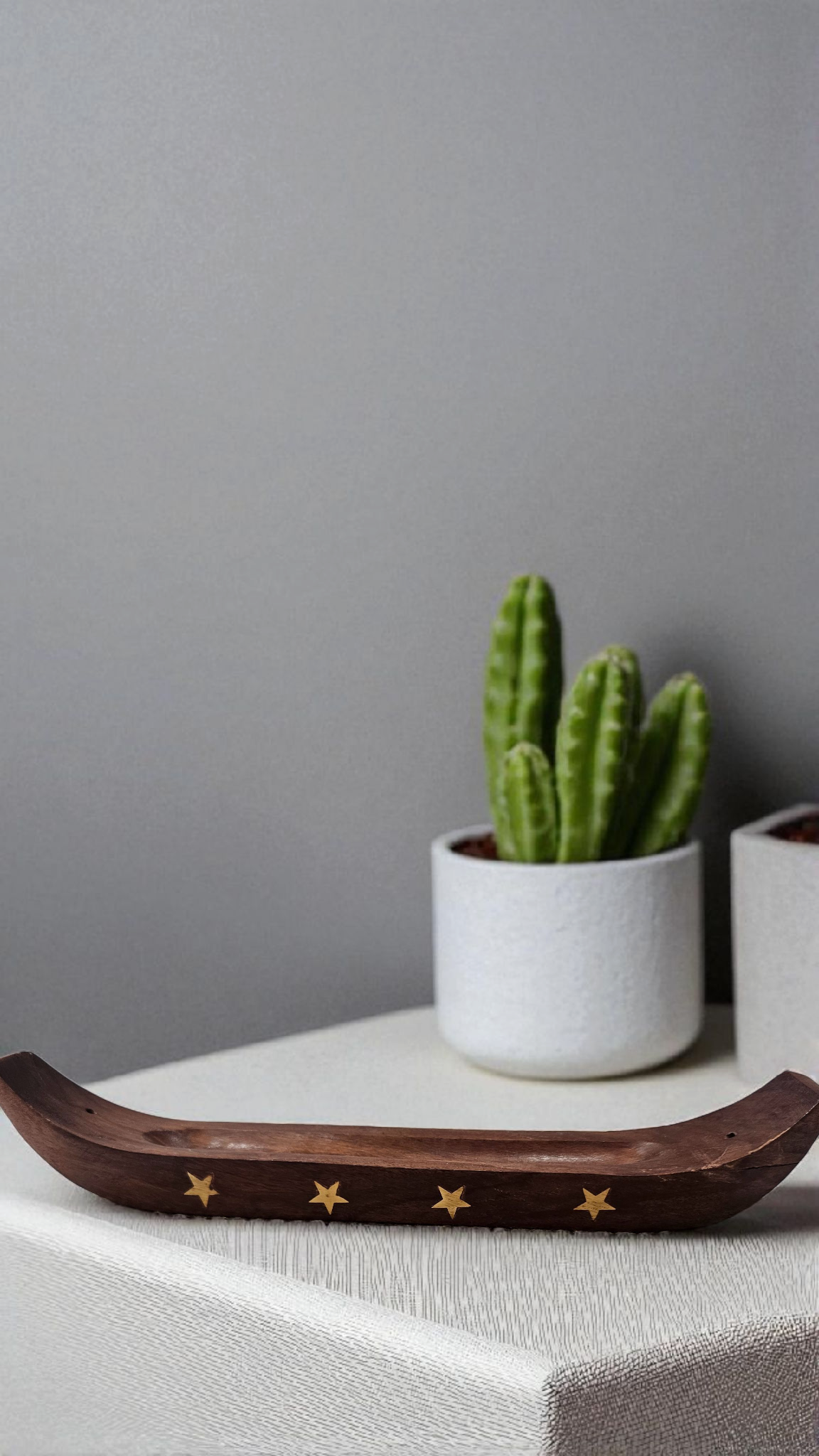 Bring serenity and heritage into your space with this beautifully handcrafted Sheesham wood incense holder. Shaped like a traditional boat with gold-tone star inlays, this piece serves both as a functional agarbatti stand for daily puja and a soulful decor accent for your living room, meditation corner, or yoga space.