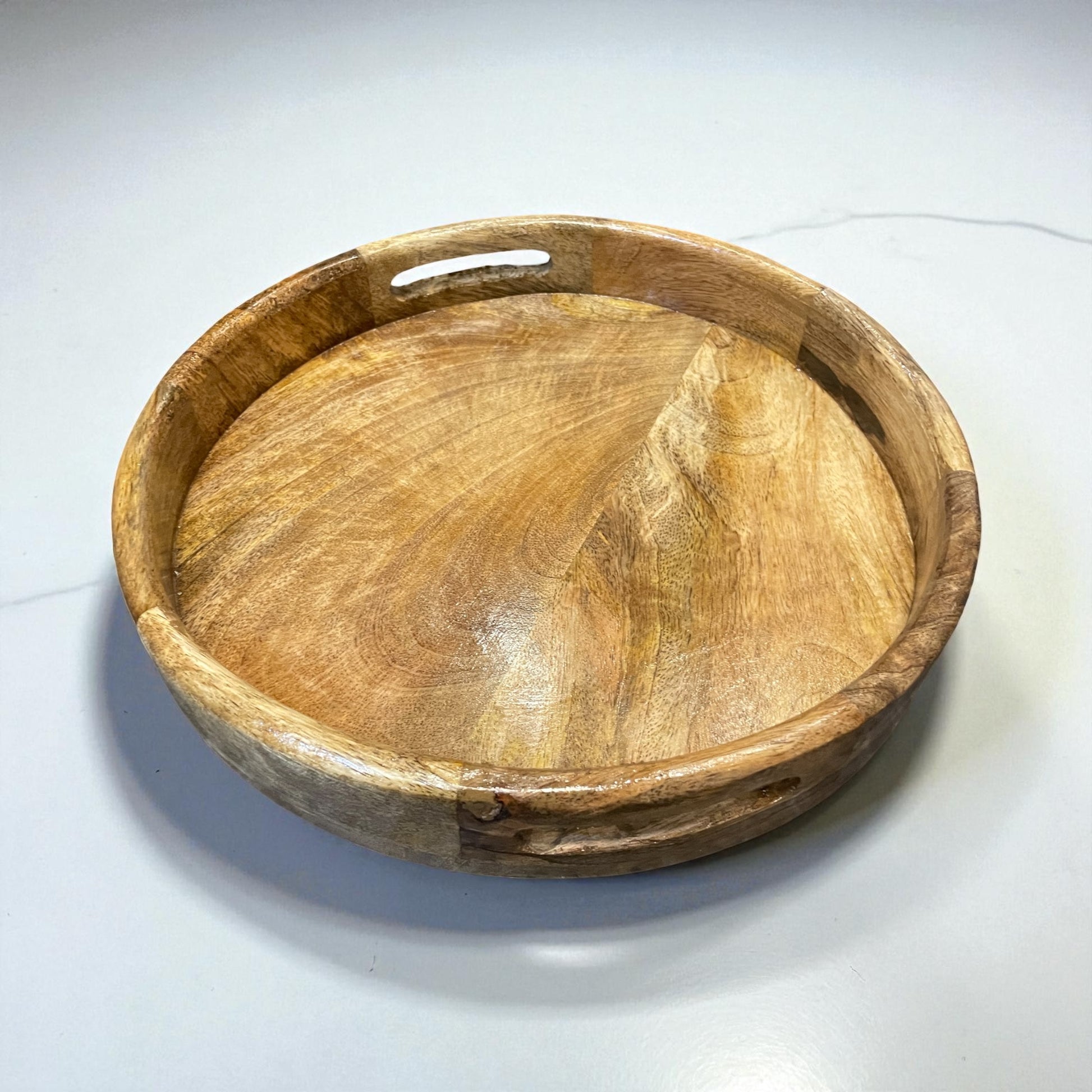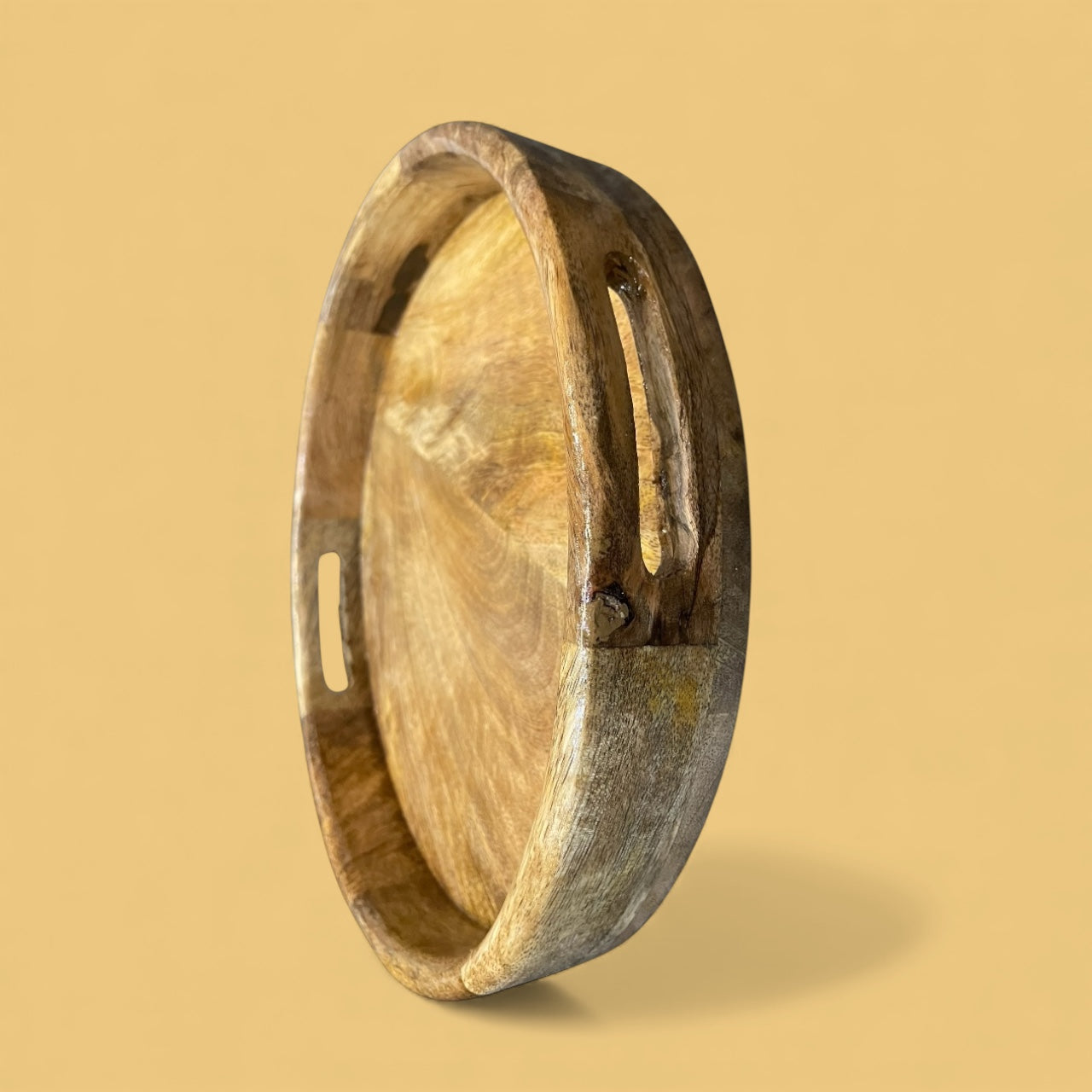 Handcrafted Sheesham Wood Round Serving Tray with Side Handles | Rustic Wooden Breakfast & Tea Tray