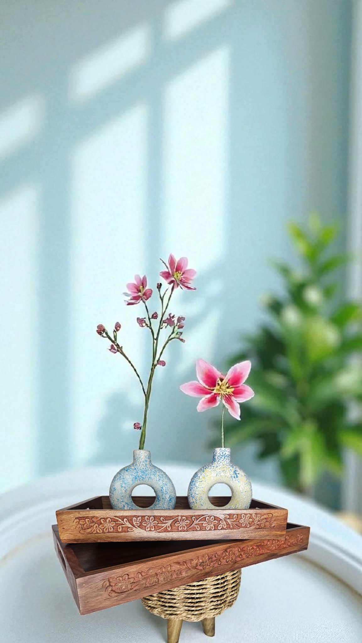 One tray in elegant plain finish, another in floral hand-carved design.