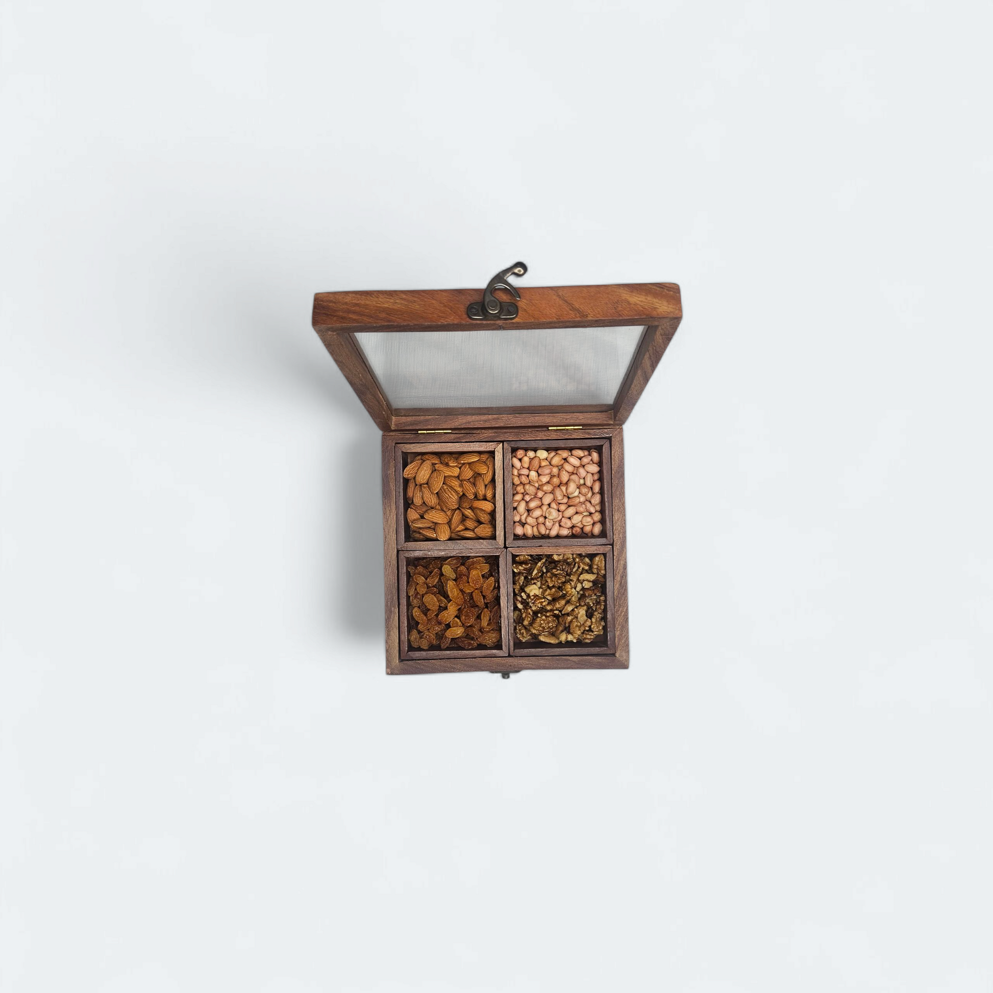 Handmade Sheesham Wood Dry Fruit Box with Transparent Lid – 4 Compartment Storage Organizer